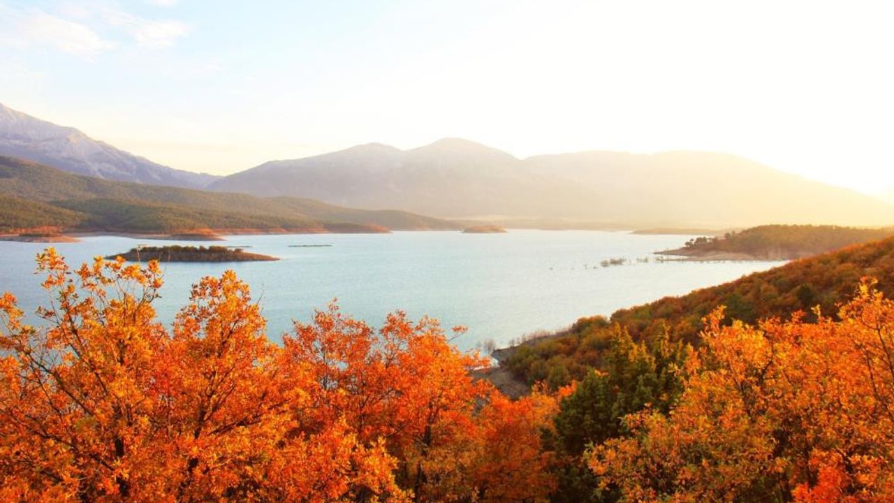 Kahramanmaraş'ın Göksun ilçeasinde Adatepe Barajı etrafı sonbahar ile birlikte renk cümbüşüne dönüştü.