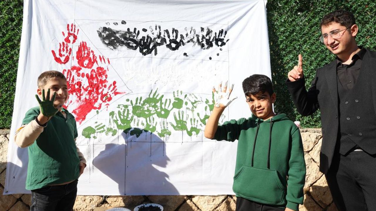 Diyarbakır'ın Eğil ilçesinde öğrenciler, "Filistin için sen de iz bırak" etkinliğine katıldı. Eğil Belediyesi tarafından İsrail'in saldırılarına tepki göstermek ve yaşanan zulme dikkati çekmek amacıyla "Filistin için sen de iz bırak" etkinliği yapıldı. Etkinliğe katılan öğrenciler, kırmızı, siyah ve yeşile boyadıkları parmaklarını ve ellerini kumaştan oluşturulan panoya basarak Filistin bayrağını simgeleyen çalışma ortaya çıkardı. Belediye Başkanı Fırat Seydaoğlu, Eğilliler ve öğrenciler olarak Filistin'de yaşananlara sessiz kalmamak için bir araya geldiklerini söyledi. Öğrencilerin katılımıyla etkinliğin daha da anlam kazandığını ifade eden Seydaoğlu, "Filistin bayrağı üzerine bir boyama çalışması gerçekleştirdik. Geçen yıl da 6 teknemize Filistin bayrağı asarak sesimizi duyurmaya çalışmıştık. Fiziki olarak orada olamasak da kalben Filistin'deki mazlum kardeşlerimizin yanında olduğumuzu tüm dünyaya duyurmak istiyoruz. İnşallah bu zulüm ve soykırım en kısa sürede son bulur" dedi.
