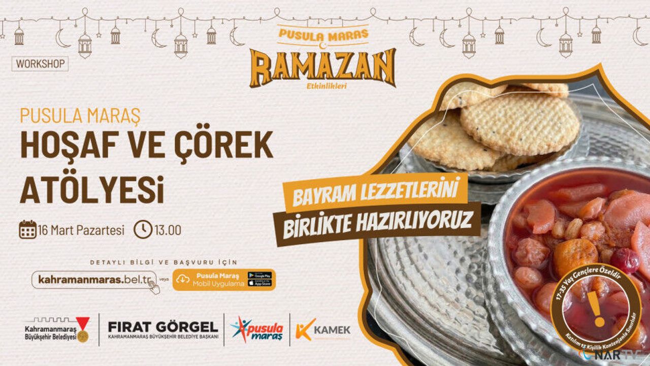Büyükşehir Belediyesinin gençlik markası Pusula Maraş, Ramazan ayına özel olarak “Hoşaf ve Çörek Yapım Atölyesi” düzenliyor. 16 Mart Pazartesi günü gerçekleştirilecek etkinlikte gençler, Ramazan sofralarının vazgeçilmez tatlarından hoşaf ve çöreğin yapımını öğrenme fırsatı bulacak.