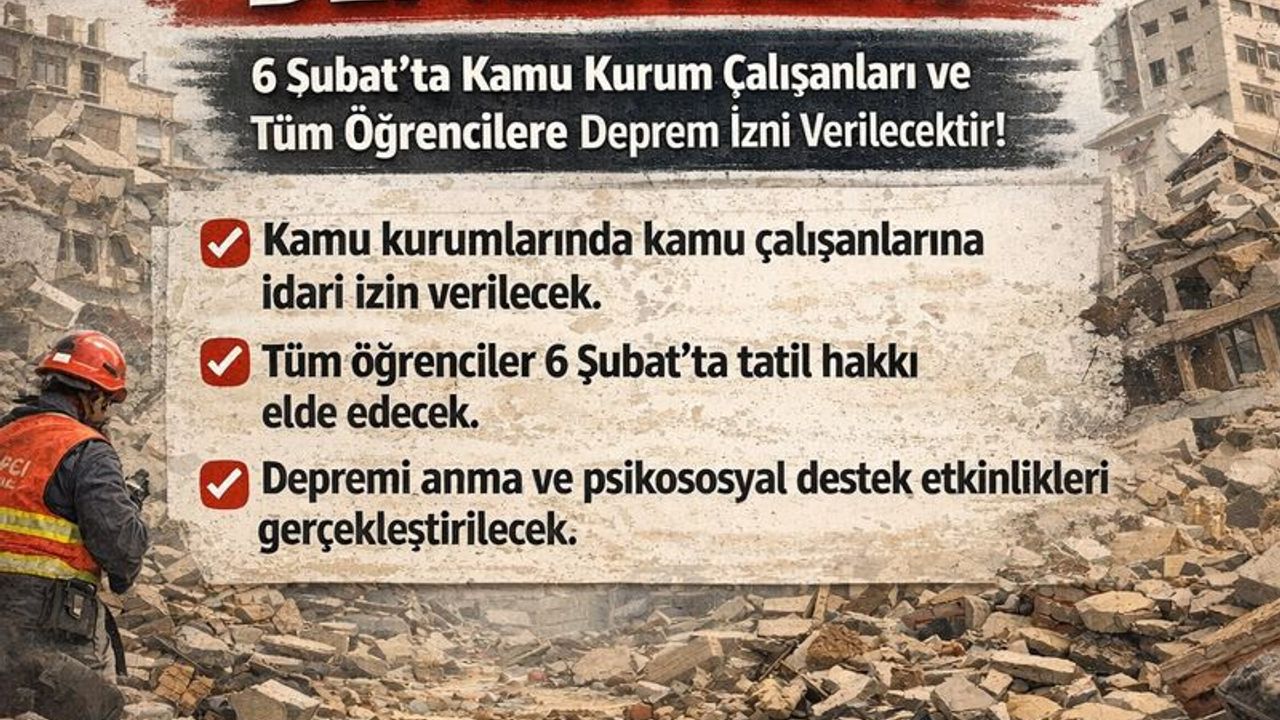 Kurum yöneticileri tarafından gerekli tedbirlerin alınarak hizmetlerin aksatılmaması ve zorunlu hizmetlerin yürütülmesi (sağlık, ulaşım, asayiş/güvenlik v.s.) için asgari düzeyde personel bulundurulması kaydıyla kamu kurum ve kuruluşlarındaki bütün çalışanlar 6 Şubat 2026 tarihinde idari izinli sayılacaktır" denildi.
