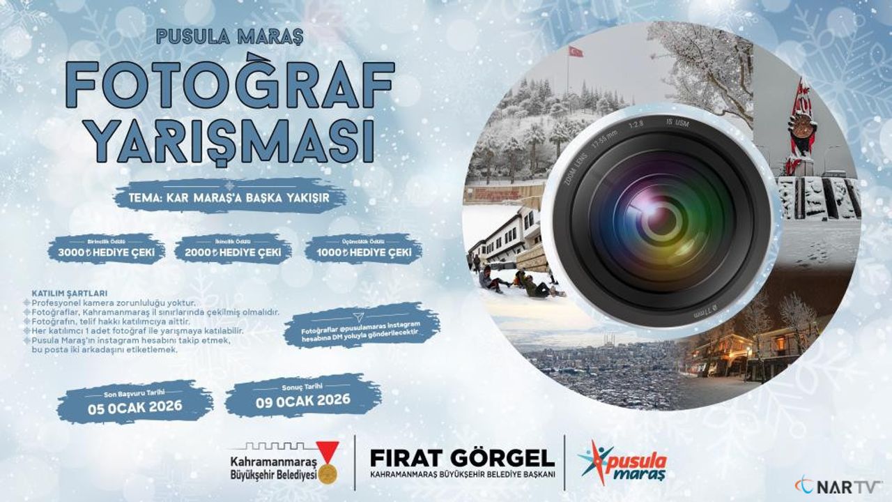 Kahramanmaraş Büyükşehir Belediyesinin gençlere yönelik markası "Pusula Maraş", şehrin doğal güzelliklerini ve kış atmosferini yansıtan özel bir etkinliğe daha imza atıyor. Bu kapsamda, "Kar Maraş’a Başka Yakışır" temalı fotoğraf yarışması başlatıldı. Kahramanmaraş il sınırları içerisinde çekilen kar temalı fotoğrafların yarışacağı etkinliğe başvurular başladı. Fotoğraf tutkunlarını ve gençleri bir araya getirmeyi amaçlayan yarışma ile şehrin beyaz örtü altındaki eşsiz manzaralarının objektiflere yansıması hedefleniyor. Yarışmaya katılmak isteyenler, tema ile uyumlu olarak çektikleri bir fotoğrafı, "Pusula Maraş"’ın instagram hesabına mesaj (DM) yoluyla göndererek başvuruda bulunabilecek. Katılımın ücretsiz olduğu yarışmada, başvurular 5 Ocak Pazartesi günü sona erecek. Başvuruların tamamlanmasının ardından jüri tarafından yapılacak değerlendirme sonucunda dereceye giren katılımcılar 9 Ocak Cuma günü kamuoyuna duyurulacak. Yarışmada birinci olan katılımcıya 3 bin TL, ikinciye 2 bin TL, üçüncüye ise bin TL değerinde hediye çeki verilecek. "Pusula Maraş" tarafından yapılan açıklamada, yarışmaya ilişkin tüm detaylara ve başvuru şartları sosyal medya hesabı üzerinden ulaşılabileceği belirtildi.