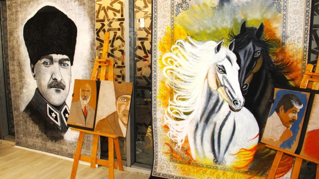 Kahramanmaraş’ın Afşin ilçesinde, şehitlerin karakalem portrelerini çizerek ailelerine hediye etmesiyle "Şehitlerin Ressamı" olarak tanınan ressam Ülger Gülbahar, halıları tuval olarak kullanarak özgün eserler ortaya koyduğu ilk kişisel sergisini açtı.