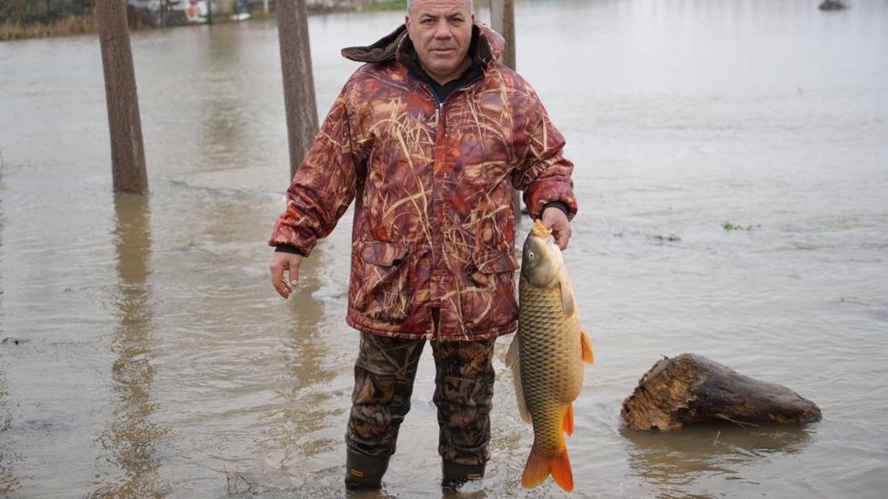 Edirne'de Meriç Nehri'nin taşmasının ardından bir vatandaşın tarlasında ortaya çıkan yaklaşık 7 kilogramlık sazan balığı, taşkının bıraktığı ilginç görüntülerden biri oldu. Meriç Nehri'nin taşmasının ardından ilginç bir olay yaşandı. Taşkın sularının çekilmesiyle birlikte bir vatandaşın tarlasında yaklaşık 7 kilogram ağırlığında sazan balığı ortaya çıkarken görüntüler bölgede dikkat çekti. Öte yandan, nehir kenarındaki diğer mülk sahipleri de benzer şekilde tarlasında ve bahçelerinde kilolarca ağırlığında balık yakaladığı öğrenildi. Tarlasında balığı gören Ahmet Doğan, sazanın havyarlı olduğunu fark ettiğini belirterek, balığı yeniden Meriç Nehri'nin derinliklerine bırakacağını söyledi.