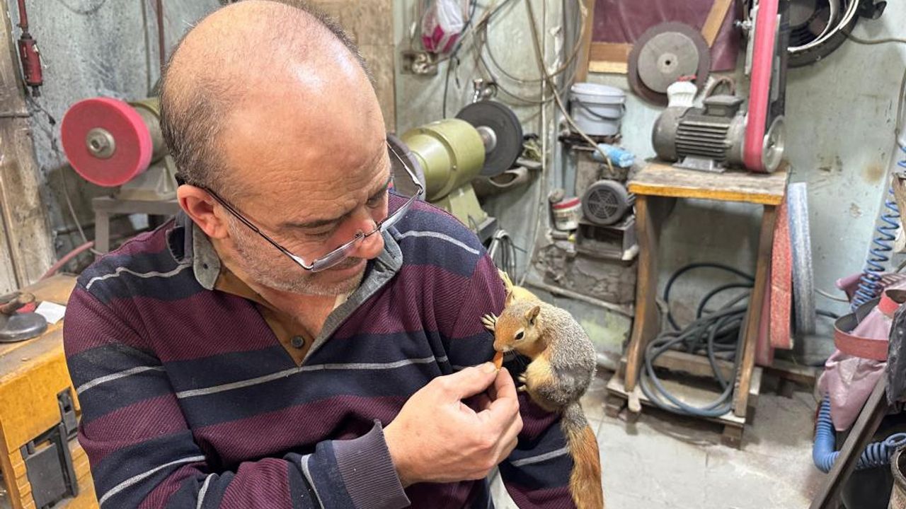 Çanakkale'nin Ayvacık ilçesinde bıçak ustası Murat Övül, orman arazisinde yapılan kesim alanında bitkin halde bulunan sincapla dostluğu görenleri kıskandırıyor. Yavru sincap 'Dadam', Övül'ün omzundan hiç inmiyor. Ayvacık ilçesi Ümmühan Mahallesi'nde Babakale bıçakları üretimi ustası Murat Övül (53) ile 'Dadam' ismini verdiği sincabının dostluğu görenleri hayrete düşürdü. Yanından bir dakika bile ayrılmayan yavru sincabıyla beraber el yapımı bıçak üreten Övül, sincabının en yakın dostu olduğunu belirtti. Övül, 4.5 aydır beraber olduğu sincabıyla adeta çocuk gibi ilgileniyor. Sincabının üzerinden nadiren indiğini belirten Murat Övül, "Sincabım benim yakın arkadaşım. Çalışırken, işteyken sokaktayken üzerimden hiç inmez.